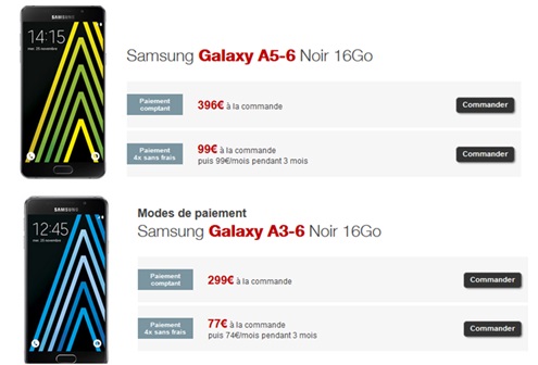 Pour info, le Galaxy A3 2016 est au prix de 309.90€ avec un forfait B&You sans engagement de Bouygues Telecom et le Samsung Galaxy A5 2016 à 409.90€. Le Galaxy A5 2016 est également disponible avec un forfait sans engagement Red By SFR au prix de 408.99€ et le Galaxy A3 2016 à 308.99€. Avec un forfait Sosh, le Galaxy A3 2016 est au prix de 309€, le Galaxy A5 2016 n’est pas encore disponible chez Sosh. Virgin Mobile les propose également à 401.99€ pour le Galaxy A5 2016 et le galaxy A3 2016 à 309.90€.