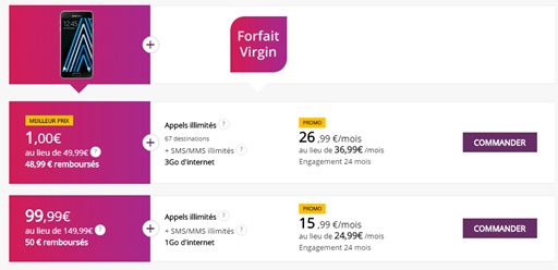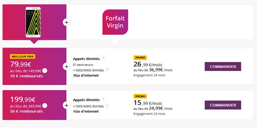 Pour la souscription à un forfait avec engagement de 24 mois en promo également à vie, Virgin Mobile vous offre jusqu’à 70€ pour l’achat d’un nouveau Smartphone.