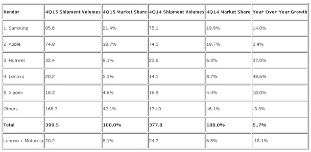 La quatrième place est attribuée au constructeur Lenovo avec 5.1% de part de marché et 20.2 millions de terminaux vendus au quatrième trimestre 2015 et la cinquième position au constructeur Xiaomi avec 4.6% de part de marché et 18.2 millions de mobiles vendus sur cette même période.