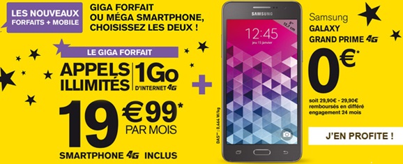 La Poste Mobile vous propose d’acquérir le Galaxy Grand Prime 4G à 29.90€ à la commande avec la souscription à un forfait illimité avec 1Go de data à 19.99€ par mois avec un engagement de 24 mois. Grâce à la remise différée Samsung valable jusqu’au 14 février 2016, le Galaxy Grand Prime 4G vous revient à 0€.