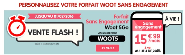 La vente flash proposée le 29 javnier 2016 par NRJ Mobile sur son forfait illimité avec 5Go de data valable uniquement pendant 3 jours touche à sa fin ce soir 01 février minuit. L’opérateur vous offre une réduction de 5€ par mois à vie pour toute souscription au forfait illimité sans engagement avec 5Go de data soit à 15.99€ par mois au lieu de 20.99€. Pour bénéficier de cette réduction, il vous suffit d’indiquer lors de la souscription le code promo « WOOT5 »,