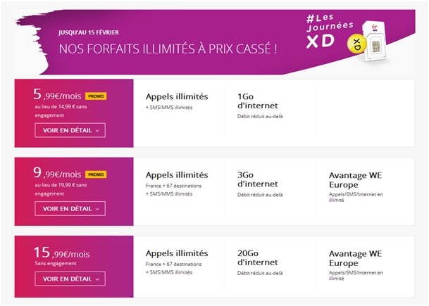 Et si vous êtes un gros consommateur de data, l’opérateur Virgin Mobile vous propose également un forfait qui répondra à vos attentes. En effet, dans le cadre des « Journées XD », cet opérateur propose un forfait illimité 20Go à 15.99€ par mois à vie et sans engagement de durée.