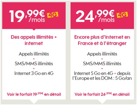 Le forfait 24/24 5Go est proposé au prix de 24.99€ par mois. Ce forfait 4G comprend les mêmes avantages que le forfait 3Go avec un accès Internet avec un volume de 5Go par mois en 4G (débit réduit au-delà) et le Roaming avec 5Go de data depuis l’Europe et les DOM valable toute l'année ainsi que les appels illimités vers la France en téléchargeant l’application Libon.