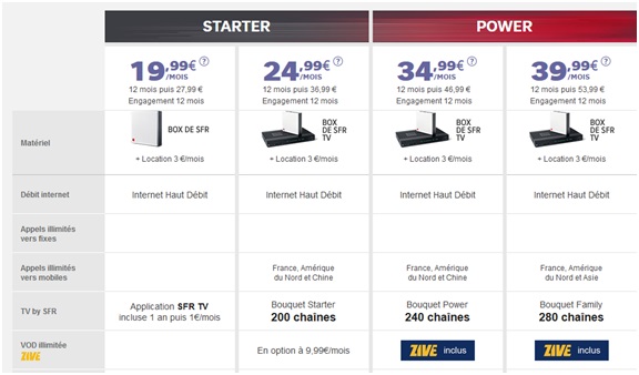 -La Box Power de SFR est en promo à 34.99€ par mois au lieu de 46.99€ par mois pendant 1 an (s’ajoute la location de la box à 3€ par mois). Cette offre intègre un accès Internet Haut débit ainsi que le téléphone illimité vers les fixes en France et vers 100 destinations internationales et vers les mobiles en France, Amérique du Nord et Chine. La TV avec le bouquet Power intégrant 240 chaînes est incluse dans l’abonnement et l’option VOD illimitée Zive est offerte avec cette.