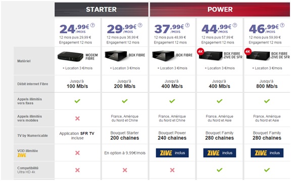 -La Box Fibre Power de SFR est en promo à 37.99€ pendant 1 an puis 48.99€ par mois, la box est en location à 3€ par mois en plus de l’abonnement. Cet abonnement intègre un accès Internet très haut débit jusqu’à 400Mbt/s et le téléphone illimité vers les fixes en France et vers les fixes de 100 destinations internationales et vers les mobiles en France, Amérique du Nord et Chine. Le bouquet Power avec 240 chaînes est inclus dans cette offre et l’option VOD illimitée Zive est offerte.