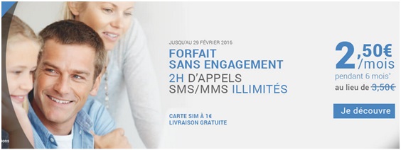 -Le forfait 2H SMS et MMS illimités + 1Go est à 7.50€ au lieu de 9.50€ pendant 6mois. Cette formule comprend 2h d'appels par mois ainsi que les SMS et MMS illimités et un accès Internet avec un volume de 1Go par mois en 4G (débit réduit-au-delà).
