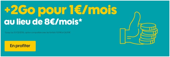 L’opérateur Sosh propose depuis le mois de novembre dernier, pour 1€ de plus par mois à vie au lieu de 8€, l’option 2Go afin de surfer depuis votre mobile à prix avantageux. Cette option sans engagement est disponible avec les forfaits Sosh illimités avec 3Go ou 5Go de data, vous profitez ainsi d'un forfait Sosh avec appels, SMS et MMS illimités et 5Go d'internet sur votre smartphone à 20.99€ par mois au lieu de 27.99€ ou encore avec 7Go à 25.99€ au lieu de 32.99€ par mois. Cette offre promotionnelle est disponible chez Sosh jusqu’au 10 février prochain.