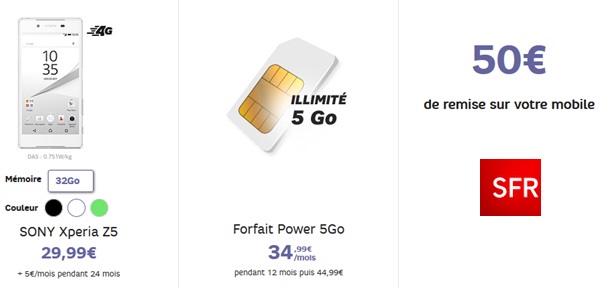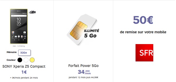 Pour l’achat du Sony Xperia Z5 entre le 05 et 08 février 2016 minuit, SFR vous offre une remise immédiate de 43€ ainsi qu’une remise différée de 50€ valable jusqu’au 29 février 2016 avec le forfait Power 5Go sur 24 mois. Pour l’achat du Sony Xperia Z5 Compact, SFR vous offre une remise différée de 50€ toujours avec le forfait Power 5Go sur 24 mois.