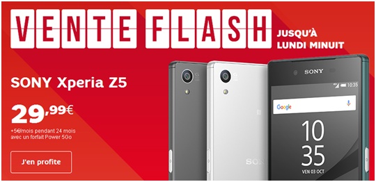 L’opérateur SFR vous propose actuellement une offre de remboursement de 50€ valable sur le Sony Xperia Z5. Ce smartphone vous revient donc à 29.99€ après remboursement au lieu de 79.99€ puis 5€ pendant 24 mois avec le paiement en 24 fois sans frais. Vous avez également la possibilité de payer ce smartphone au comptant soit 149.99€ après remboursement au lieu de 243€.