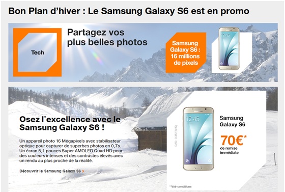 -Le Samsung Galaxy S6 est en promo à 29.90€ au lieu de 99.90€ avec la remise immédiate de 70€, sur 12 mois le Galaxy S6 est au prix de 49.90€ au lieu de 169.90€ avec les deux promotions possibles avec la remise immédiate de 70€ par Orange et 50€ sur demande par le constructeur Samsung (ODR valable jusqu’au 14 février 2016). La remise de 50€ par le constructeur n’est pas disponible avec le forfait Play 8Go avec engagement de 24 mois.