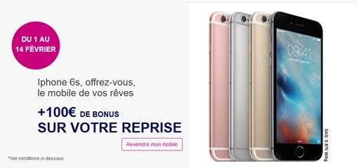 Bouygues Telecom vous propose une remise de 100€ en plus du montant de la reprise de votre ancien Smartphone jusqu’au 14 février prochain pour toute souscription à un forfait Sensation avec engagement de 24 mois et l’achat d’un iPhone 6, iPhone 6Plus ou encore iPhone 6s et iPhone 6s Plus.