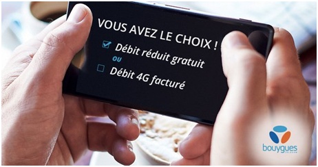 L’opérateur Bouygues Telecom avait informé ses clients en janvier dernier d’un changement sur leur abonnement mobile. En effet, depuis le 15 février 2016, les clients peuvent désormais choisir le mode de consommation au-delà de l’enveloppe Internet mobile incluse au forfait. Plus précisément, au-delà du forfait data intégré, vous choisissez de continuer à surfer en 3G ou 4G avec une facturation au Mo (de 0.01€ à 0.05€ par Mo) consommé ou à vitesse réduite sans facturation.