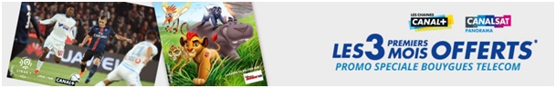 Pour tout nouvel abonnement d’un an aux chaines Canal+ et/ou CanalSat Panorama, Séries-Cinéma ou Grand Panorama entre jusqu'au 29 février prochain, Bouygues Telecom vous offre les 3 premiers mois. Cette offre est réservée aux personnes non abonnés à CANAL+ et/ou CANALSAT au cours des six derniers mois et sous réserve d’éligibilité technique. Les frais d’activation pour bénéficier des chaînes Canal sont facturés 50€ et les abonnements Bbox de l’opérateur sont disponibles à partir de 19.99€ par mois pour la Bbox ou encore à partir de 25.99€ pour la Bbox Miami.