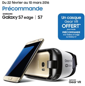 Pour toute précommande avant le 10 mars 2016, vous pouvez profiter d’un casque Gear VR offert et ainsi vivre une expérience visuelle incroyable grâce à la vision panoramique 360° du casque et à l’écran Super AMOLED du Galaxy S7. Pour recevoir votre casque Gear VR, vous devez renvoyer le bulletin de participation avec les pièces justificatives demandées. Si votre dossier respecte les conditions de l’offre, vous recevrez votre casque Gear VR dans un délai de 10 semaines (à compter de la date limite d’envoi des dossiers).