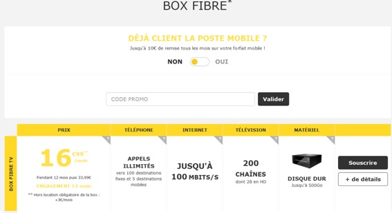 La nouvelle offre Fibre La Poste Mobile à terminaison coaxiale est en promo à 16.99€ par mois pendant 1 an puis 33.99€ par mois. Cet abonnement soumis à un engagement de 12 mois comprend un accès Internet très haut débit jusqu'à 200Mb/s selon éligibilité technique ainsi que le téléphone illimité vers les fixes de 100 destinations et vers les mobiles des Etats-Unis, Canada et Chine. Ce nouvel abonnement Fibre intègre également un accès à plus de 200 chaînes TV et services dont 36 chaînes HD et plus de 30 000 VOD accessibles. Le décodeur TV fourni dispose d'un enregistreur numérique de 160Go inclus dans l’offre. Paliers de débridage payants accessibles : de 160Go à 320Go : facturé 15€ ; de 320Go à 500Go : facturé 15€.