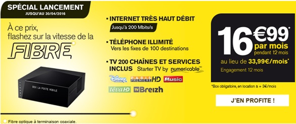 La Poste Mobile qui s'appuie sur les infrastructures de l'opérateur SFR propose une offre Fibre à terminaison coaxiale accessible directement sur son site Web. Pour le lancement de cet abonnement internet très haut débit, l'opérateur vous offre une remise de 17€ par mois pendant 1 an soit à 16.99€ par mois au lieu de 33.99€ auquel s'ajoute la location de la box obligatoire à 3€ par mois. Cette promotion est valable pour toute nouvelle souscription jusqu'au 30 Avril 2016.