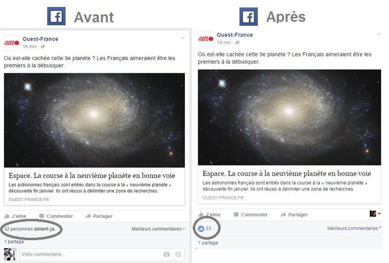 Aujourd'hui, les facebookiens pourront constater sur leur mur d'actualités les toutes nouvelles vignettes emoticônes de like, mais aussi de 'j'adore', 'grrr', 'wahou', 'triste' ou 'ahah' sous chacun des posts. Un moyen plus visuel de connaître le nombre de personnes intéressées par notre actu et de définir plus précisément leur sentiment sur le sujet ! Pour ce qui est des commentaires ou des partages il faudra encore attendre un peu avant de découvrir le nouveau look que facebook voudra bien leur donner. Voyez ici la différence relevée, sur un article du même jour, c'est à dire aujourd'hui, 24 février 2016, à 3 minutes d'intervalle pour le simple like (pouce relevé) :