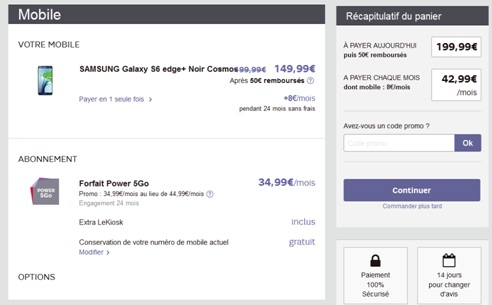 -341.99€ au lieu de 451.99€ en payant ce Samsung au comptant, le forfait Power 5Go associée à cette vente flash est actuellement en promo à partir de 34.99€ la première année puis 44.99€ par mois, avec une remise de 5€ par mois en exclu Web et une remise de 5€ dans le cadre d'une portabilité de numéro et ce pendant 1 an.