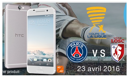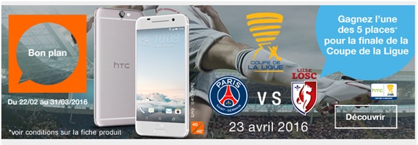 Orange en partenariat avec HTC vous offre la possibilité de remporter une place de foot pour la finale de la Coupe de la Ligue française de football du 23/04/2016. L'opération est valable entre le 22 février et 31 Mars 2016, pour tout achat d'un HTC One A9 avec la souscription à un forfait Origami ou un forfait bloqué M6 Mobile de l'opérateur avec engagement de 12 ou 24mois. Une fois votre commande passée, recevez le bon HTC de participation.