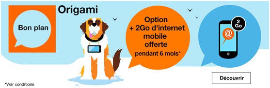-Le forfait Origami Play 8Go Orange ou encore 10Go pendant 6 mois est en promo à partir de 44.99€ pendant 1 an puis à 54.99€ par mois avec un engagement de 24 mois ou 50.99€ au lieu de 60.99€ sur 12 mois avec achat de Smartphone ou encore en promo à 29.99€ au lieu de 39.99€ sur 12 mois et sans mobile. Cette offre comprend les mêmes avantages que le forfait Origami Play 4Go avec cette fois 8Go d’internet par mois sur Smartphone jusqu'en 4G.