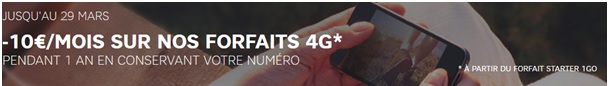 -Le forfait Starter 24/24 + 1Go en promo à partir de 9.99€ par mois au lieu de 24.99€ en optant pour un engagement de 12 mois et sans achat de mobile et si vous êtes abonné BOX SFR (sous conditions de portabilité de numéro)