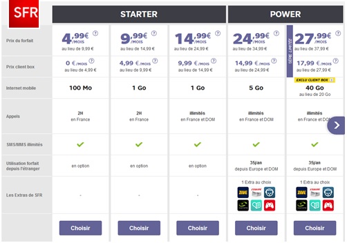 -Le forfait Starter 2H + 1Go à partir de 4.99€ par mois (au lieu de 14.99€) si vous êtes abonné Box SFR