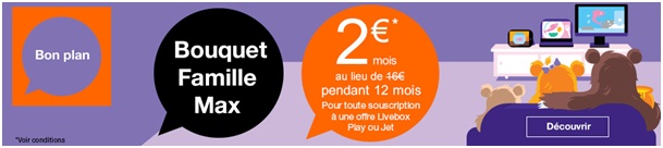 Jusqu’au 6 avril, vous pouvez également bénéficier du Bouquet Famille Max à 2€ par mois pendant 12 mois au lieu de 16€ avec les offres Livebox Play et Livebox Jet. Pour en profiter, vous devez choisir une offre Livebox ADSL ou Fibre (hors Livebox Zen) et à l’étape « services », cochez l’option Bouquet Famille Max. Votre remise de 14€ par mois pendant 12 mois sera appliquée automatiquement !