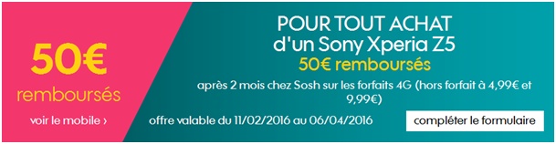 L’opérateur Sosh vous propose le Sony Xperia Z5 à 599€ au lieu de 699€ grâce à un remboursement différé de 50€. Cette offre de remboursement est valable jusqu’au 6 avril avec la souscription à un forfait 4G Sosh (hors forfait à 4.99€ et 9.99€). Pour en bénéficier, il vous suffit de renvoyer le bulletin de participation avec les pièces justificatives demandées. Vous recevrez votre remboursement dans un délai de 2 mois.