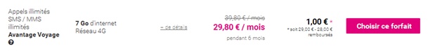 Jusqu’au 27 avril 2016, profitez de la Série Limitée 7Go à 29.80€ par mois pendant 6 mois au lieu de 39.80€. Ce forfait intègre les appels illimités vers tous les fixes et mobiles tous opérateurs 24h/24, 7j/7, Internet Mobile en H+/4G jusqu'à 7 Go (débit réduit au-delà) ainsi que les SMS et MMS illimités vers tous les opérateurs 7j/7, 24h/24.