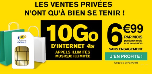 L’opérateur La Poste Mobile propose depuis 3 semaines un forfait sans engagement qui rivalise avec toutes les ventes privées que les opérateurs ont pu mettre en place jusque là : Une formule à seulement 6.99€ par mois pendant 6 mois puis 19.99€ par mois au delà disponible jusqu’au 28 mars 2016.