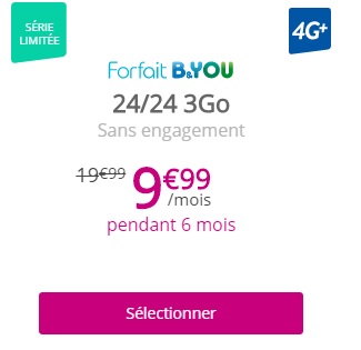 L’opérateur Bouygues Telecom propose depuis le 1er mars et jusqu’au 20 mars prochain une remise de 10€ par mois pendant 6 mois sur les forfaits sans engagement B&YOU 3Go et plus. Vous pouvez donc par exemple profiter d’un forfait B&YOU 24/24 3Go à seulement 9.99€ par mois pendant 6 mois au lieu de 19.99€ en série limitée
