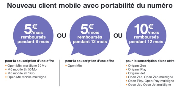 Si vous souscrivez à l’offre Open Mini, vous bénéficiez de 5€ remboursés pendant 12 mois. Pour finir, si vous optez pour une offre Origami Zen, Play, Jet ou Open Zen, Play ou Jet multiligne, votre remboursement sera de 10€ par mois pendant 12 mois.