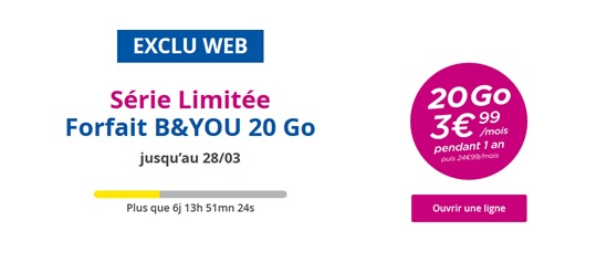 Bouygues Telecom propose actuellement une offre exceptionnelle à savoir un forfait sans engagement B&YOU 24/24 20Go à seulement 3.99€ par mois pendant 12 mois au lieu de 24.99€. Cette offre disponible en exclusivité web est proposée jusqu’au 13 décembre inclus.