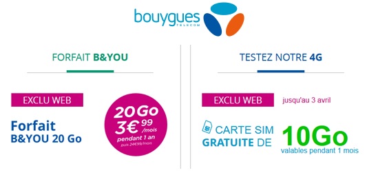 Jusqu'au 3 avril 2016, l’opérateur Bouygues Telecom vous propose une offre exclusive web à savoir une carte SIM gratuite avec 10Go pendant 1 mois et résiliable automatiquement à la fin de la promo. Cette offre va vous permettre de découvrir la qualité du réseau 4G de Bouygues Telecom gratuitement et sans engagement. Celle-ci est réservée aux 150 000 premières souscriptions.
