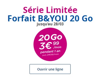 L’opérateur Bouygues Telecom multiplie actuellement les offres promotionnelles et propose un forfait sans engagement B&YOU 24/24 20Go à seulement 3.99€ par mois pendant 12 mois au lieu de 24.99€. Cette offre disponible en exclusivité web pour tout le monde est proposée jusqu’au 28 mars inclus. Ne perdez pas de temps !