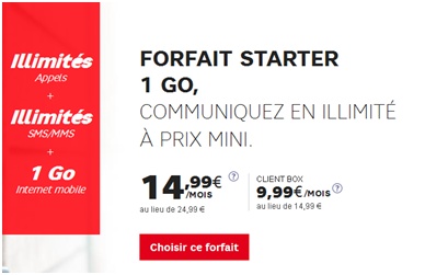 Le forfait Starter 1Go est actuellement au prix de 14.99€ par mois au lieu de 24.99€ (avec un engagement de 12 mois) grâce à une remise spéciale pendant 1 an de 5€ par mois ainsi qu’une remise de 5€ par mois pendant également 12 mois si vous conservez votre numéro. Et si vous êtes client box, votre forfait Starter 1Go vous revient à 9.99€ par mois au lieu de 14.99€. En quelques mots, ce forfait comprend les appels illimités ainsi que les SMS et MMS illimités. Pour la partie internet mobile, ce forfait intègre 1Go de data.