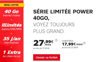 La Série Limitée Power 40Go est proposée actuellement à 27.99€ par mois (engagement de 12 mois) au lieu de 37.99€ également grâce à la remise spéciale de 5€ par mois pendant 12 mois ainsi que la réduction de 5€ par mois pendant 12 mois en cas de portabilité du numéro. En quelques mots, cette Série Limitée intègre 40Go d’internet mobile. Vos appels, SMS et MMS sont illimités. De plus, vous bénéficiez de votre forfait à l’international comme en France 35 jours par an. Autre avantage, vous bénéficiez d’un extra au choix.