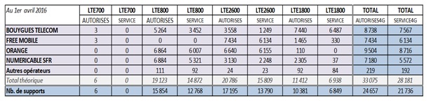 Cet observatoire dresse également le bilan des sites 4G en service en métropole par opérateur. Au 1er Avril 2016, l’opérateur historique Orange est toujours en tête avec 8 716 sites en service (+ 104 sites en un mois) suivi par l’opérateur Bouygues Telecom avec 7567 sites (+264 sites en service en un mois)