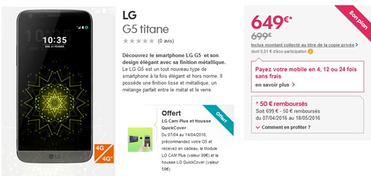 Le LG G5 est disponible en précommande à 699€ avec la souscription à un forfait Sosh à partir de 4.99€ et en optant pour un forfait illimité 5Go ou 10Go actuellement en promo pendant 12 mois à partir de 9.99€ par mois, bénéficiez d'une remise différée de 50€ soit le LG G5 à 649.90€. Cette promotion est valable jusqu'au 18 Mai 2016. Et entre le 07 et 14 Avril, recevez en cadeau une housse LG QuickCover et un module LG Cam Plus pour l'achat de ce LG avec Sosh. Rappelons que la marque Low Cost d'Orange vous propose de régler votre nouveau Smartphone au comptant ou encore en 4, 12 ou 24 fois sans frais.