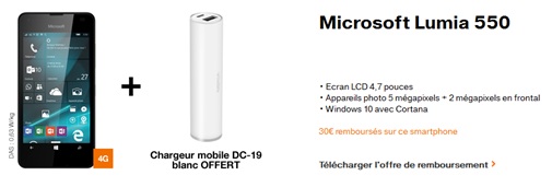 Microsoft Lumia 550 : 30€ remboursés et un chargeur mobile DC-19 offert avec un forfait Orange