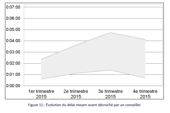 Cet indicateur traduit le temps d’attente entre la sortie du serveur vocal interactif et la prise en charge par un conseiller des appels passés auprès du service client d’assistance technique de l’opérateur. Parmi ces appels, seuls ceux liés à des motifs techniques pour lesquels le client a été mis en relation avec un chargé de clientèle sont comptabilisés. Les mesures de cet indicateur distinguent, d’une part, le délai moyen avant décroché par un conseiller et, d’autre part, le taux de décroché après le serveur vocal interactif. Il convient de noter que le temps de réponse par les services clients est indépendant des marchés ou accès considérés. Les appels pour motif commercial et les appels perdus avant la mise en relation avec un chargé de clientèle ne sont pas comptabilisés dans les mesures.