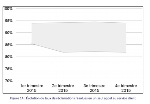 Une réclamation est un appel au service client qui exprime un problème pour un motif aussi bien technique que commercial. Cet indicateur traduit la qualité des réponses apportées par le service client de l’opérateur en mesurant le taux de réclamations qui ne génèrent pas de second appel pour un motif identique dans un délai de 7 jours. Les demandes d’information et les réclamations par courrier ou par mail ne sont pas prises en compte pour le calcul du taux