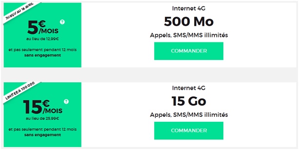 L’opérateur RED By SFR vous propose jusqu’au 18 avril prochain un forfait RED illimité 500Mo à 5€ par mois à vie. En effet, vous pouvez bénéficier d’une remise exceptionnelle de 7.99€ par mois sur le forfait RED illimité 500Mo. Et si vous avez besoin de plus de data, cet opérateur vous propose aussi un forfait RED illimité 15Go pour 15€ par mois à vie.