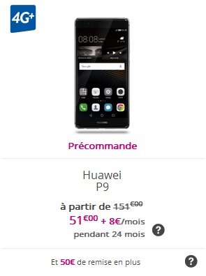 En ce qui concerne le prix, ce smartphone est proposé en ce moment au meilleur prix chez Bouygues Telecom. En effet, celui-ci est disponible à la commande à 539.90€ chez Bouygues Telecom contre 549€ chez SOSH ou encore RED By SFR. De plus, Bouygues Telecom vous rembourse 50€ en différé soit votre nouveau Huawei P9 à 489.90€. Avec un forfait Sensation Bouygues Telecom, le Huawei P9 est proposé à partir de 129.90€ soit 79.90€ après remboursement différé de 50€.