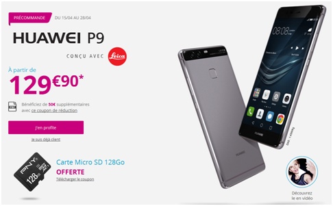 L’opérateur Bouygues Telecom vous propose depuis aujourd’hui de précommander le nouveau smartphone premium de la marque Huawei, le P9. Les précommandes se déroulent du 15 au 28 avril prochain et pour toute précommande effectuée vous recevez en cadeau une carte Micro SD de 128Go.