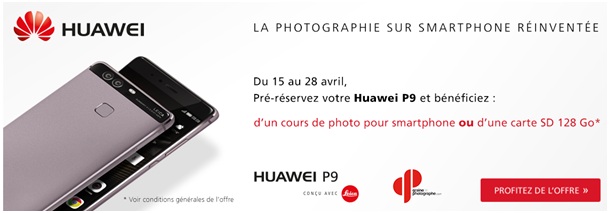 Le prix du Huawei P9 varie de quelques euros d'un opérateur mobile à un autre, le premier Smartphone du constructeur chinois équipé d'un double appareil photo 12 Mpx conçu avec Leica est au moins cher chez Bouygues Telecom grâce à la remise différée de 50€ avec un prix de 489.90€, chez les concurrents il faudra débourser au moins 50€ de plus. Et pour profiter pleinement de vos usages internet via votre nouveau Smartphone, ces opérateurs mobiles vous proposent des offres illimitées avec des enveloppes data entre 5Go et 50Go par mois à moins de 20€ par mois. En réservant votre Huawei P9 entre le 15 et 28 Avril, profitez de l'offre de lancement proposée par le constructeur chinois, avec soit une carte SD de 128Go offerte ou un cours de photo pour smartphone avec grainedephotographe.com en vous connectant sur www.huawei-offres.fr, cette opération est valable chez les différents opérateurs mobiles.