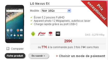Le Google Nexus 5X est désormais proposé chez Free Mobile à 299€ au lieu de 429€ soit une baisse de prix de 130€. Profitez-en ! Et si vous le souhaitez vous pouvez payer seulement 77€ à la commande puis 74€ par mois pendant 3 mois.