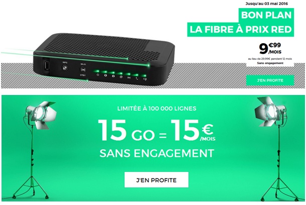 Vous cherchez une offre internet pas chère ? Ne ratez pas le bon plan disponible actuellement chez Red By SFR qui vous propose une remise exceptionnelle de 20€ par mois pendant 12 mois sur son offre Fibre. En promo jusqu’au 03 Mai 2016 inlcus, la box Red est au prix bradé de 9.99€ par mois au lieu de 29.99€ la première année. En optant pour cet abonnement très haut débit ou haut débit selon votre éligibilité technique, vous économisez 240€ sur votre facture Internet et dans le cadre d’un changement de fournisseur d’accès Internet, l’opérateur vous rembourse vos frais de résiliation jusqu’à hauteur de 100€. La portabilité de votre numéro fixe est désormais possible et simplifie vos démarches de résiliation de votre ancien FAI. Alors pourquoi continuer à payer plus cher, pour des services équivalents d’autant plus que la RED Fibre est sans engagement.