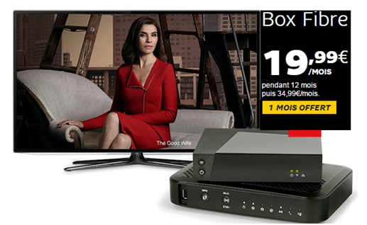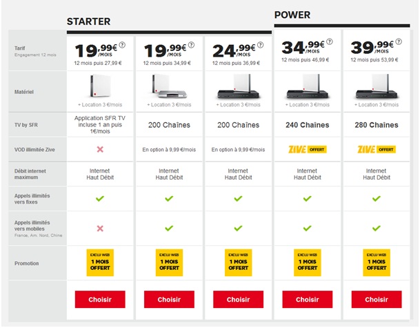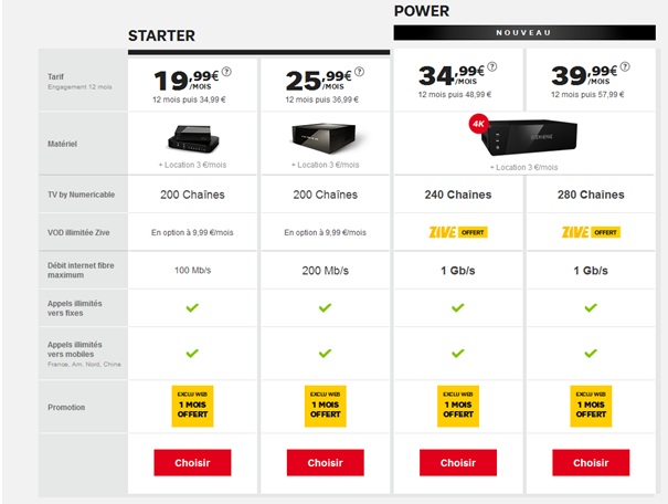 -La Box Starter Fibre de SFR est en promo à 25.99€ pendant 1 an puis 36.99€ par mois, la box est en location à 3€ par mois en plus de l’abonnement. Cette offre comprend un accès Internet très haut débit jusqu’à 200Mbt/s et le téléphone illimité vers les fixes en France et vers les fixes de 100 destinations internationales et vers les mobiles en France, Amérique du Nord et Chine. Le bouquet Starter avec 200 chaînes est inclus dans cette offre et l’option VOD illimitée Zive est disponible en option à 9.99€ par mois.