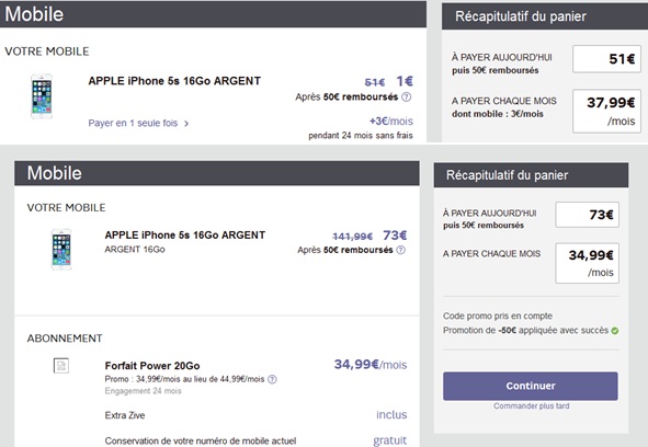 - 1€ au lieu de 51€ (ODR de 50€) puis 3€ par mois pendant 24 mois avec le paiement en 24 fois sans frais. (la remise immédiate de 50€ n'est pas compatible avec le paiement en 24 fois sans frais pour l'ihone 5S).